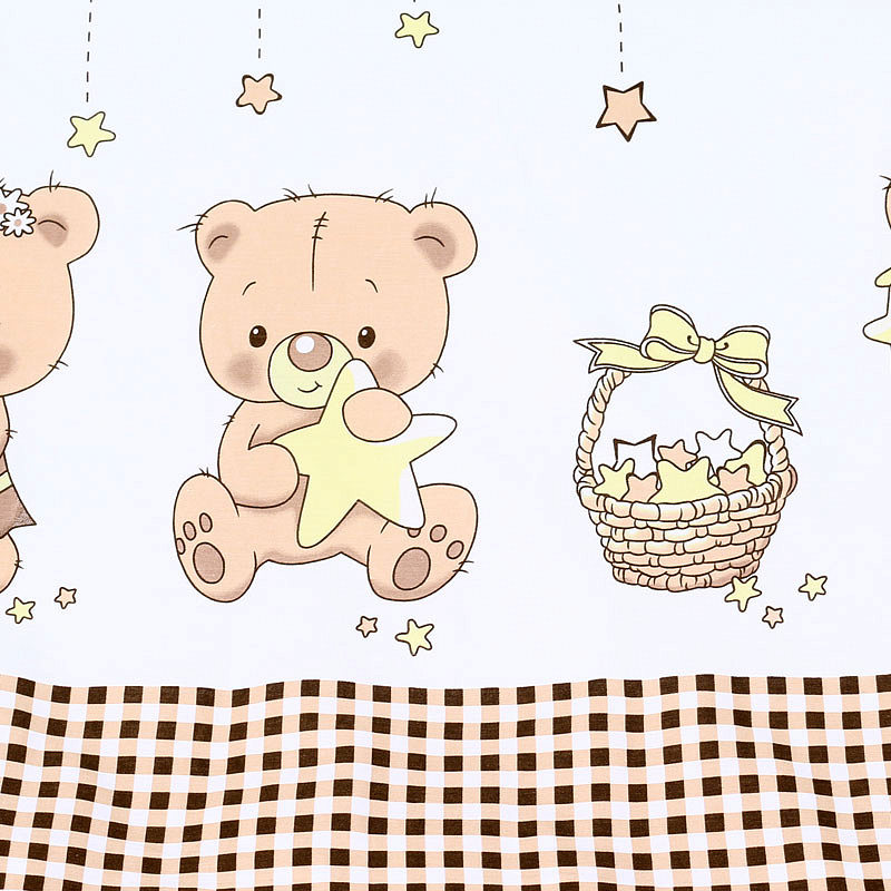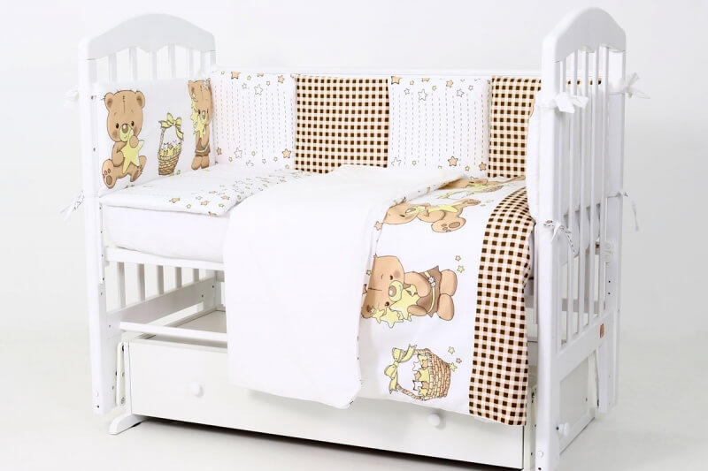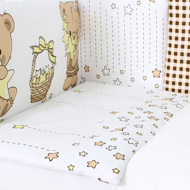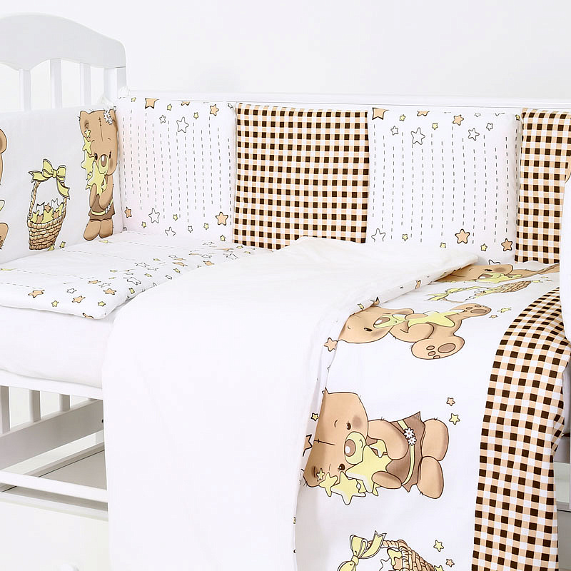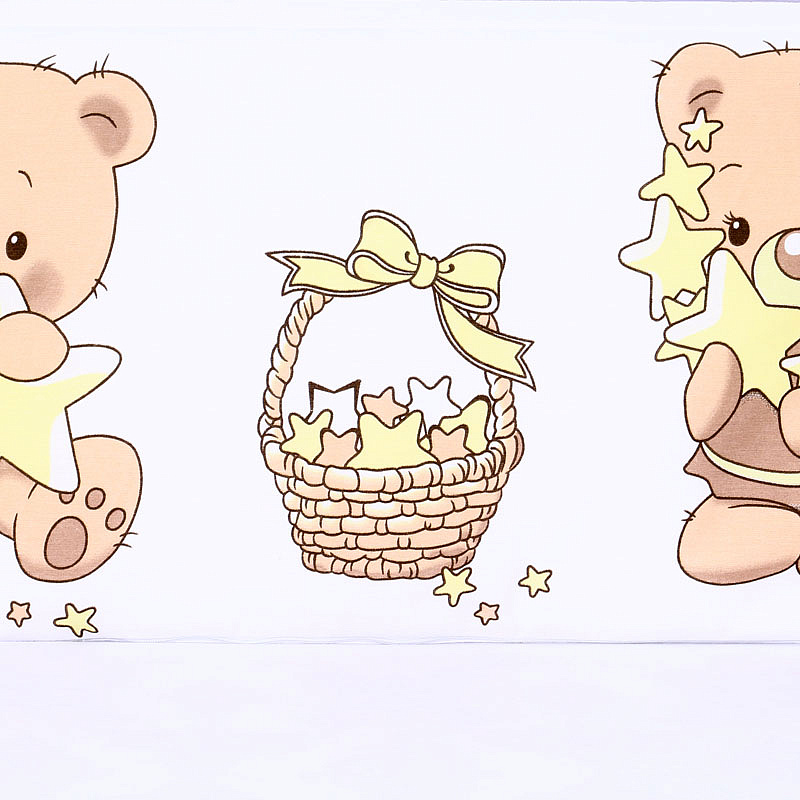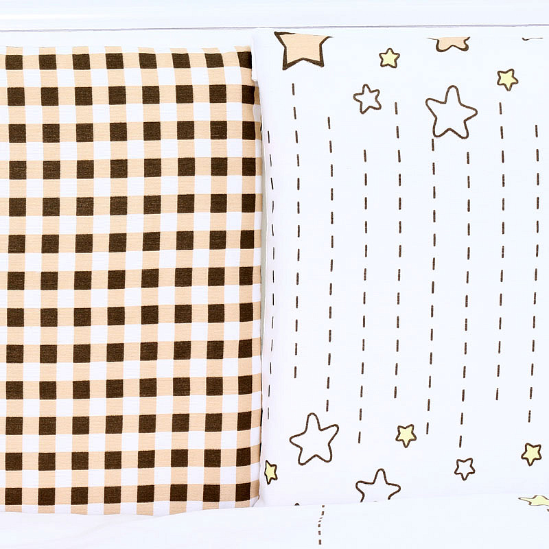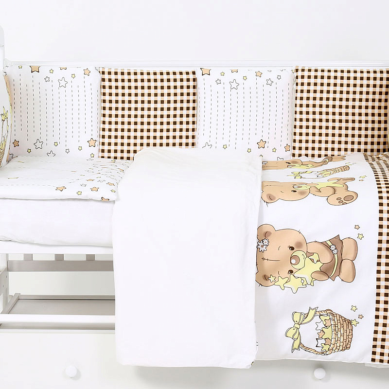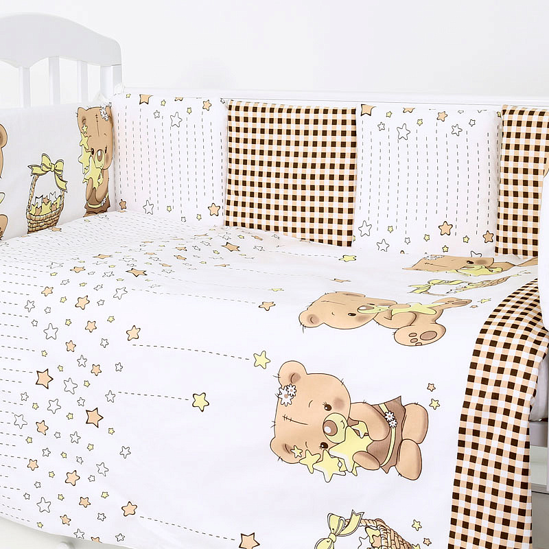 Комбнинированный комплект «Звездочеты» — это набор постельного белья, произведенный в России из высококачественных материалов — бязи и сатина (натурального хлопка). На этом белье белого цвета нанесены изображения мишек и звезд. Бортики-подушки снабжены завязками для крепления к кроватке. Простыня оснащена резинкой, чтобы полностью облегать матрас и не образовывать складки. Чехлы съемные, застегиваются на молнию, можно снимать для стирки. Наполнитель бортиков, одеяла и подушки — холлофайбер (гипоаллергенный материал). Комплект подходит для спальных мест в кроватках размером 120x60 см.