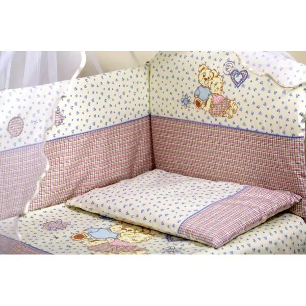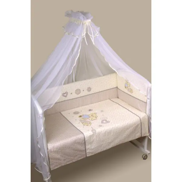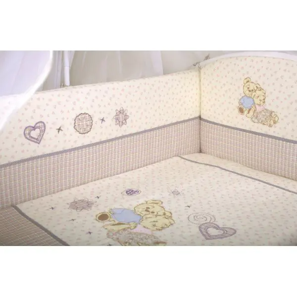 Комплект в детскую кроватку Lapetti Тедди, 6 предметов выдержан в спокойной бежевой гамме и украшен чудесными аппликациями в виде мишек Тедди. Производитель использует комбинацию тканей с разными рисунками и красивую декоративную окантовку. Все детали комплекта Lapetti Тедди выполнены из натурального сатина с гладкой, слегка шелковистой поверхностью. Ткань прекрасно стирается, не линяет и не деформируется при сушке. Набор Lapetti Тедди создает благоприятную атмосферу в спальне малыша и настраивает его на крепкий сон.