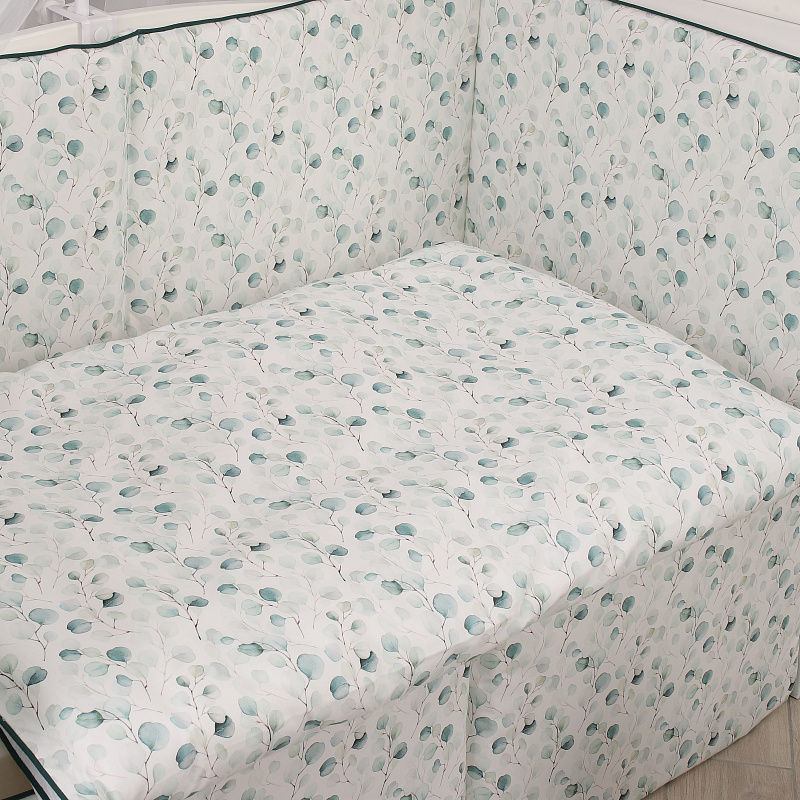 КПБ Eucaliptus подходит для кроваток с размерами спальных мест — 120x60 см и 125x65 см. Чехлы на бортиках съемные, с возможностью стирки. Надеваются и застегиваются на молнию. В набор входит легкое гипоаллергенное одеяло.