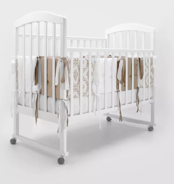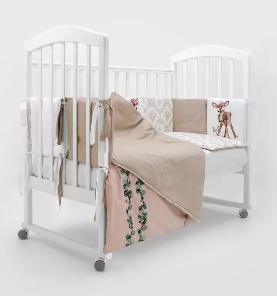 КПБ подходит для прямоугольной и овальной кроватки. Простыня на резинке не сомнется и не образует под малышом складок. Одеяло мягкое, воздушное, после стирок не деформируется. Бортики на кроватку крепятся широкими стильными лентами.