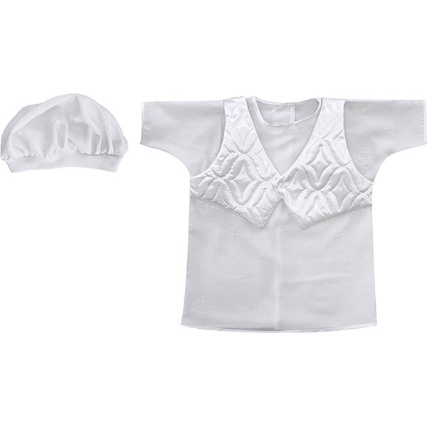 Крестильный набор Золотой Гусь рубашка и берет в двух размерах предназначен для мальчиков ростом 62 или 68 см. Модель крестильного набора Золотой Гусь привлекает оригинальным дизайном, напоминающим рубашку с жилетом. Текстура жаккардового материала в виде «крестиков» и атласный декор придают изделию особую нарядность и ощущение праздника. Все материалы крестильного набора – натуральные, не вызывают аллергических реакций на нежной коже ребенка.