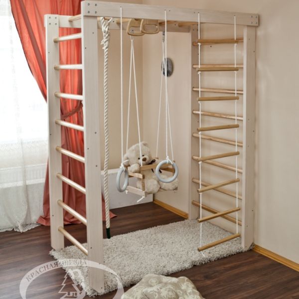 Набор детской спортивной мебели С 37 для установки дома от отечественного производителя укомплектован оптимальными деталями для естественного и правильного физического развития детей. Основной каркас и все деревянные элементы изготовлены из плоскоклеенной древесины, которая гораздо прочнее цельной древесины, и выдерживают вес до 100 кг. Набор детской спортивной мебели С 37, Красная Звезда, состоит из двух гимнастических лестниц, по верху соединенных между собой классической лестницей для рук. Внутри основных каркасных снарядов находятся подвесные качели с ограничителем, веревочная лесенка, канат и кольца для упражнений на руках. Спортивный элемент собственного производства фабрики – деревянные поручни, располагаемые на одной из перекладин лестницы для рук. Изделие имеет сертификат соответствия и международный сертификат качества FSC.