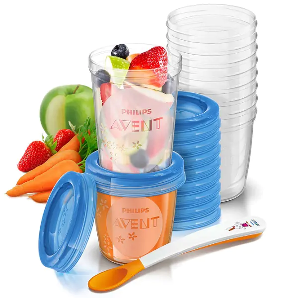 Набор контейнеров для хранения детского питания Philips Avent SCF721/20 – это 20 удобных емкостей, объемом 180 и 240 мл, с крышками и широкими «горлышками», куда удобно помещать детскую еду, предназначенную для хранения в холодильнике или морозильной камере. Контейнеры Philips Avent SCF721/20 — устойчивые, их можно устанавливать друг на друга, не боясь опрокидывания. Специальная зона для маркировки контейнеров для хранения детского питания Филипс Авент SCF721/20 позволяет делать необходимые надписи и соблюдать сроки использования продуктов.