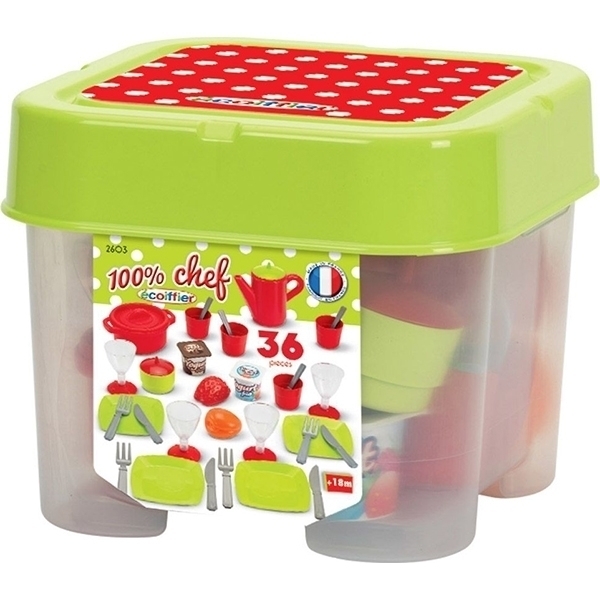 С таким комплектом кухонных принадлежностей девочка сможет быстро организовать торжественный обед на 4 персоны. Набор посудки Ecoiffier 100% Chef — это 36 красочных аксессуаров. Для подачи блюд предусмотрены столовые тарелки с вилками и ножами. Изысканные фужеры можно наполнить вкусным апельсиновым соком. А после обеда куклы насладятся ароматным чаем и десертом в виде йогурта и фруктов.