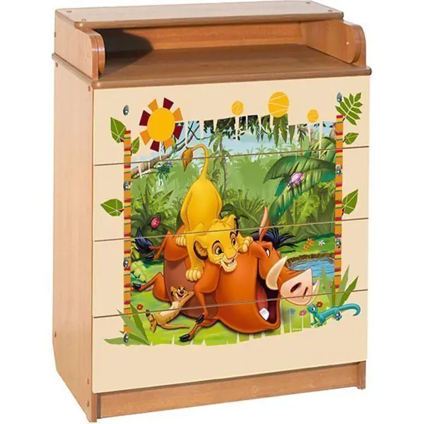 Пеленальный комод Disney КДП Симба и Нала имеет прочный фасад с красочным рисунком, нанесенным с помощью суперстойкого метода –ультрафиолетовой печати. В результате применения этой технологии изображение не выцветает на солнце и не стирается. Конструкция Disney КДП Симба и Нала изготовлена из надежных плит ЛДСП с экологически чистым составом. Дополнительным преимуществом пеленального комода Дисней КДП Симба и Нала является высококачественная фурнитура и механизм бесшумного открытия ящиков.