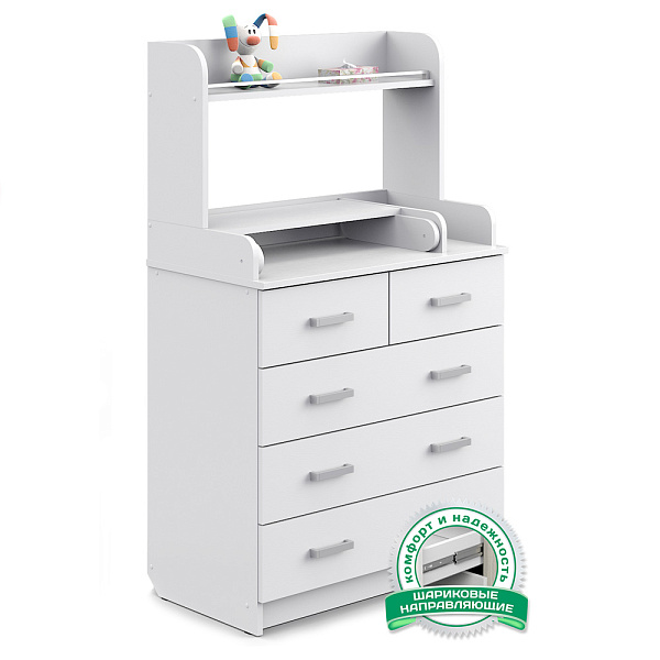 В этом комоде пять ящиков — три широких нижних и два верхних, которые в ширину равны нижним ящикам. Ящики находятся на шариковых телескопических направляющих, а значит работают плавно, без шума, не выезжают произвольно. Наверху оборудован пеленальный столик. Рядом — отделение для средств по уходу за ребенком. С полки предметы не скатываются благодаря ограничителю.
