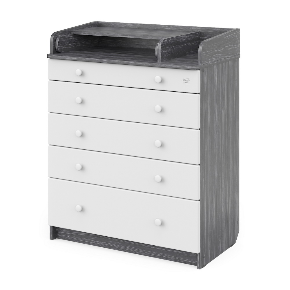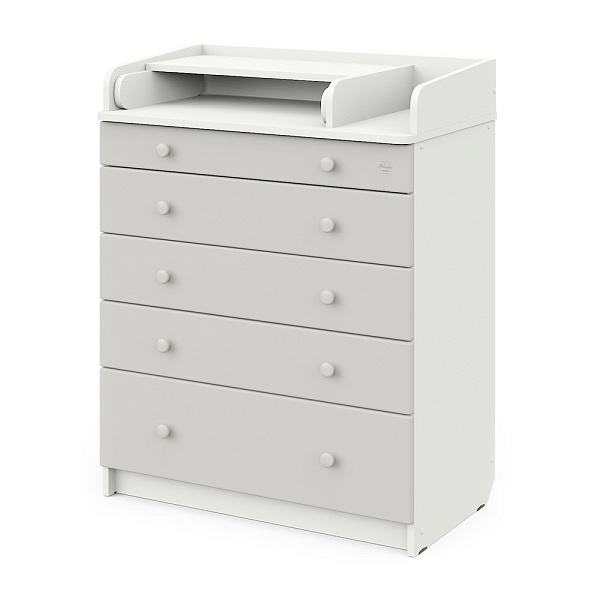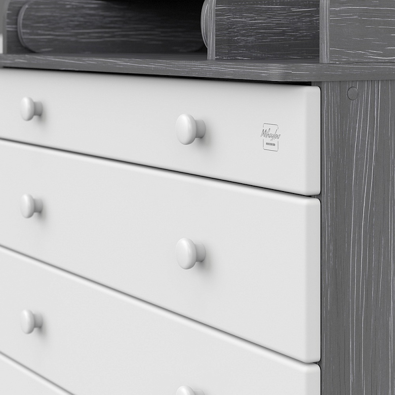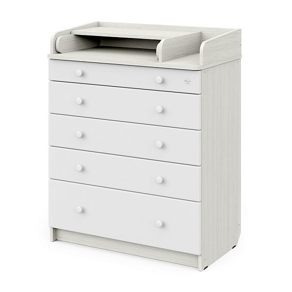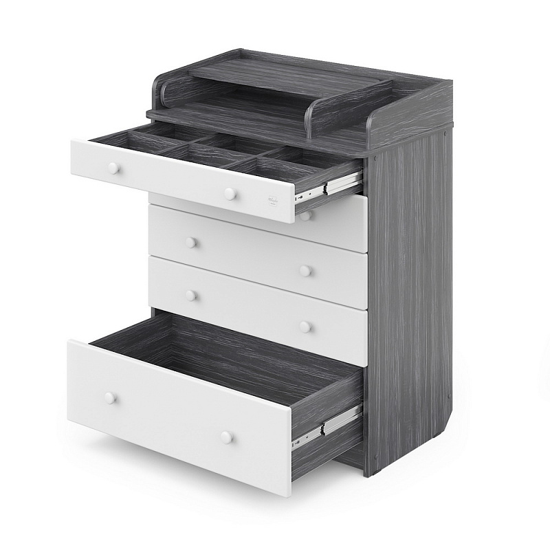 В Maks применяется столик для пеленания с простой и надежной системой раскладывания. Рядом с пеленальным столиком предусмотрено отделение для средств по уходу за ребенком. Комод весьма вместительный, включает пять ящиков, установленных на надежные шариковые направляющие с бесшумным ходом. Один из ящиков — нижний — имеет большую глубину, а верхний оснащен органайзером для более удобной сортировки детских вещей.