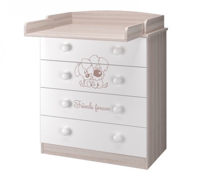 Комод с пеленальной доской удобен для массажа ребенку, на нем можно переодевать малыша, делать регулярные гигиенические процедуры. Детские вещи всегда под рукой у мамы. В остальном комод выполнен в современном дизайне и легко впишется в интерьер детской комнаты. Он оснащен четырьмя ящиками на шариковых направляющих. Ручки удобные, круглые. Материал изготовления — ЛДСП. Комод отвечает требованиям экологической безопасности. На фасад нанесен рисунок с милыми собачками.
