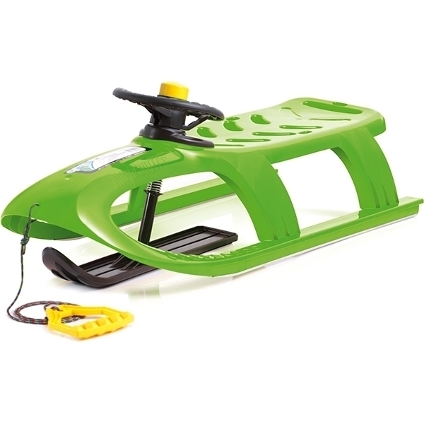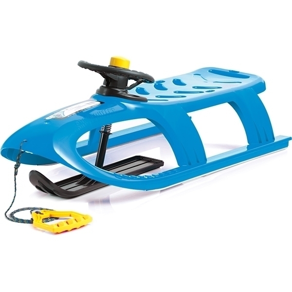Эта модель выполнена из морозоустойчивого пластика, выдерживающего температуру до -32°. Ее главная особенность — наличие руля и центральной лыжи. Благодаря им транспортным средством легко управлять во время спусков с крутых горок и объезжать препятствия на пути. Буксировочный трос с пластиковой ручкой помогает быстро забираться вместе с санками на горку.