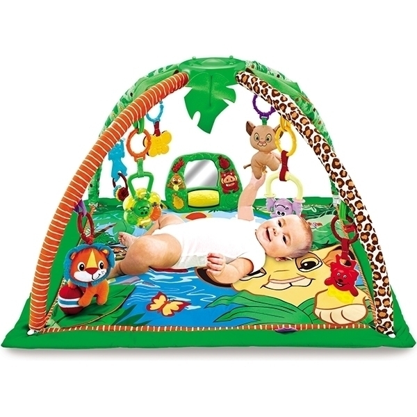 Основание дополнено мягкой вставкой. В комплект входят мягкие игрушки, погремушки, прорезыватель, музыкальная игрушка-зеркало. Вверху, на пересечении игровых дуг установлен музыкальный блок с приятными мелодиями.