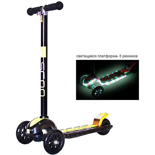 Инновационная новинка – самокат с оригинальной светящейся декой, которая переливаясь красивыми цветами, светится в пяти разных режимах. Благодаря этому фантастическому световому шоу самокат Y-Scoo Maxi Laser Show (Ай-Ску) превращает простую прогулку в настоящий праздник, полный позитива и невероятных впечатлений. Данная модель ездит на полиуретановых скоростных колесах класса HQ, этот материал обеспечивает хороший отскок, и оснащена надежными подшипниками, благодаря которым колеса крутятся быстрее, а самокат при разгоне катится самостоятельно дальше, чем аналоги. Приобрести самокат Y-Scoo Maxi Laser Show (Ай-Ску) можно по весьма приятной стоимости на сайте интернет-магазина koliaski-krovatki.ru. Оснащенный многопозиционным рулем, он обеспечивает комфортное управление в разном возрасте.