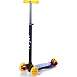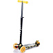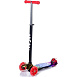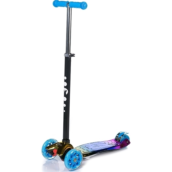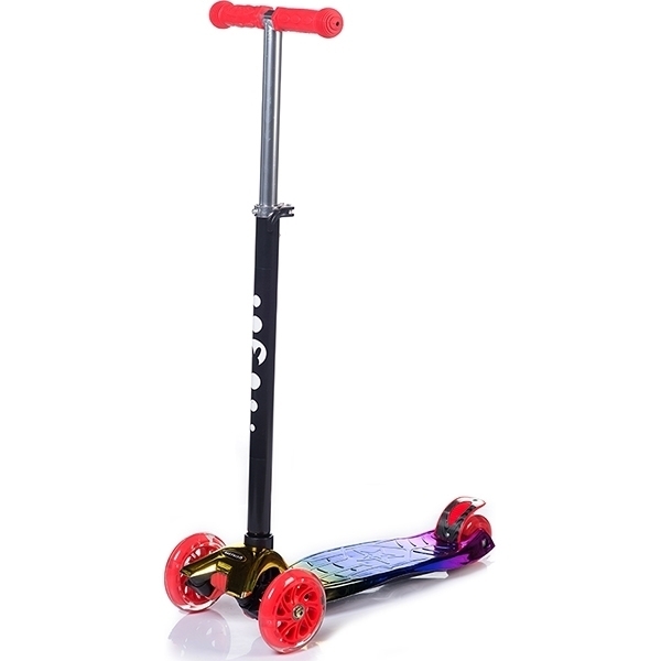 Передняя пара колес обеспечивает устойчивость на дороге. А заднее сдвоенное колесо оснащено тормозом. Яркая усиленная дека выдерживает нагрузку до 50 кг. Руль этого самоката регулируется и подстраивается под рост юного гонщика.