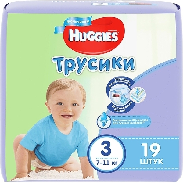 С мягкими трусиками-подгузниками для мальчиков Huggies мама может не беспокоиться о состоянии кожи малыша. Трусики произведены из микропористых гигиеничных материалов, свободно пропускают воздух, моментально выводят наружу влажные испарения. Уникальное анатомическое расположение впитывающих каналов позволяет влаге быстро проникать внутрь и равномерно распределяться по поверхности.