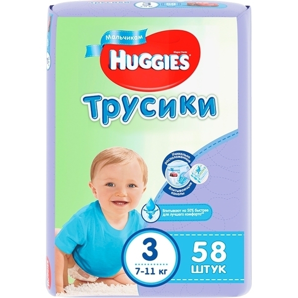Мягкие трусики-подгузники для мальчиков Huggies — настоящая ежедневная забота о коже карапуза. Они имеют супервпитывающий слой с мягкой сердцевиной, моментально поглощают влагу, распределяют ее внутри так, чтобы исключить провисание или чрезмерное набухание подгузника.