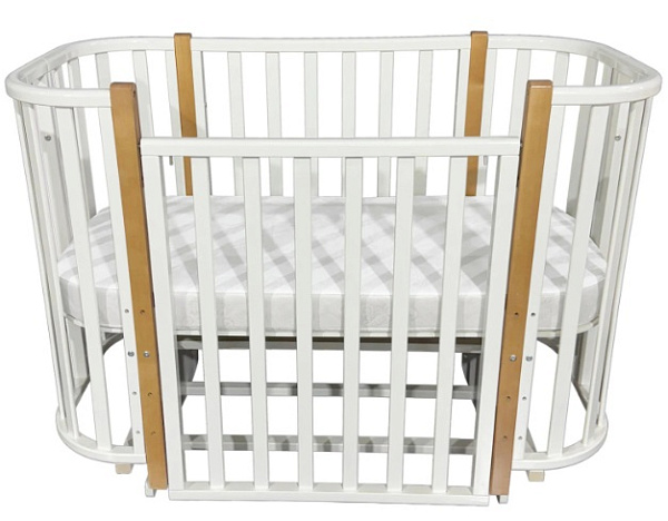 Съемная передняя стенка значительно облегчает доступ к малышу и позволяет использовать кроватку как удобный диванчик, когда ребенок немного подрастет. Дно регулируется по высоте в трех положениях, поэтому конструкция легко подстраивается под возраст малыша и его меняющиеся потребности — от новорожденного до более старшего возраста.